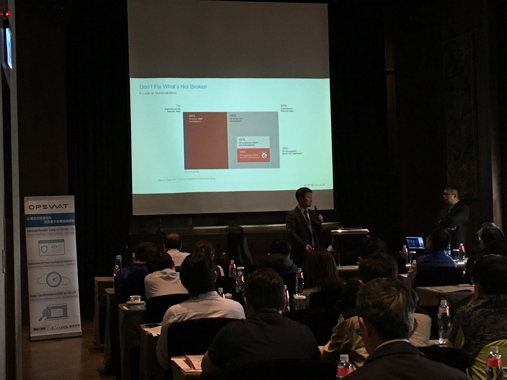 现场由OPSWAT 技术长 Taeil Goh 先生来台分享多重扫描技术(Multi-scanning) 如何利用多达 30 多个防毒引擎进行多重检测,以及内容清除重整技术 (Contend Disarm and Reconstruction, CDR) 技术之运作原理。