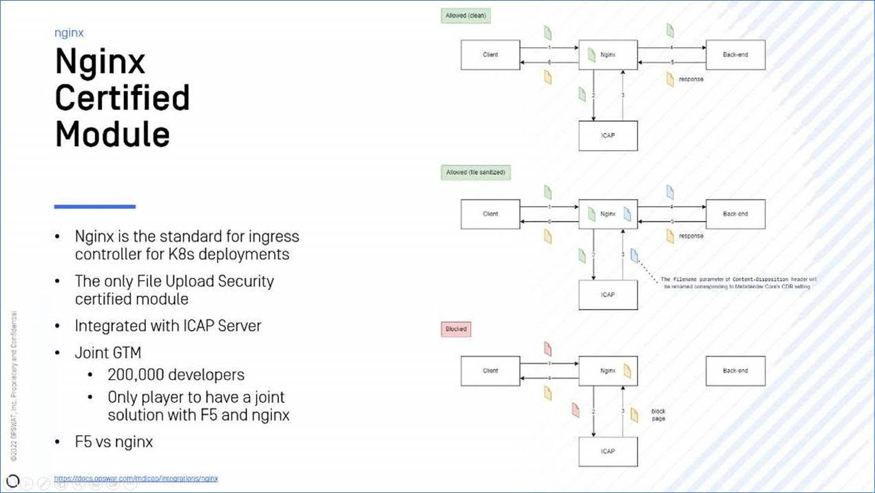 下图为OPSWAT因应Nginx微服务K8s 容器化整合架构,结合 Metadefender ICAP服务的应用示意图