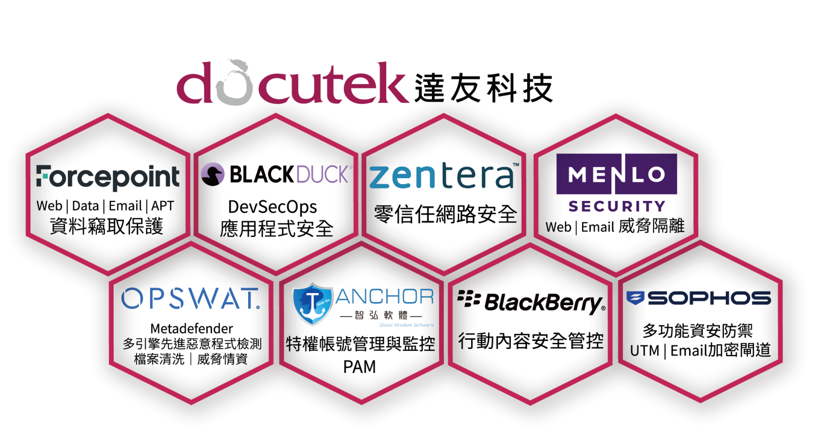 达友科技专业代理销售的信息安全品牌有:Forcepoint、BLACK DUCK(原新思科技)、欧普思安 OPSWAT、Zentera、Menlo Security、Blackberry、智弘软体ANCHOR、SOPHOS